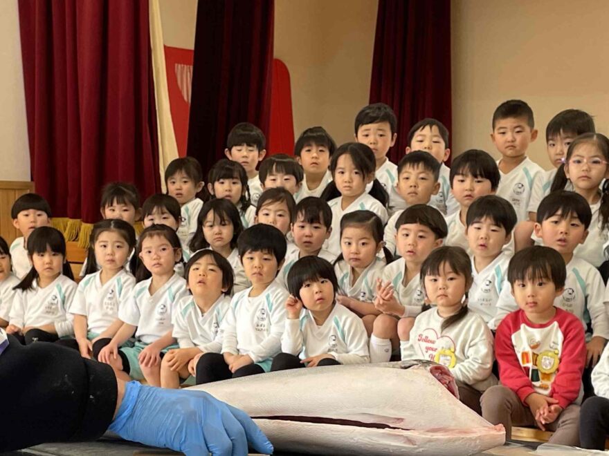園児たちは、お魚屋さんの軽快なトークと迫力ある解体の様子に目を輝かせ、普段は意識しにくい“食の裏側”を体験する貴重な時間となりました。