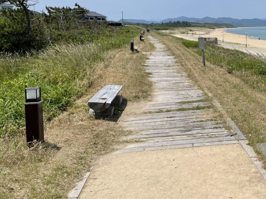 この砂浜の背後には、約13万年前の海面上昇期に形成された海浜砂層の段丘が広がっています。その後、海から運ばれた砂が風によって内陸側へ押し上げられ、長い時間をかけて古砂丘と新砂丘が重なり合う台地がつくられました。現在の穏やかな砂浜の風景の裏には、海と風が織りなすダイナミックな地形の歴史が刻まれています。