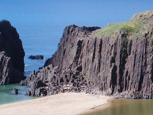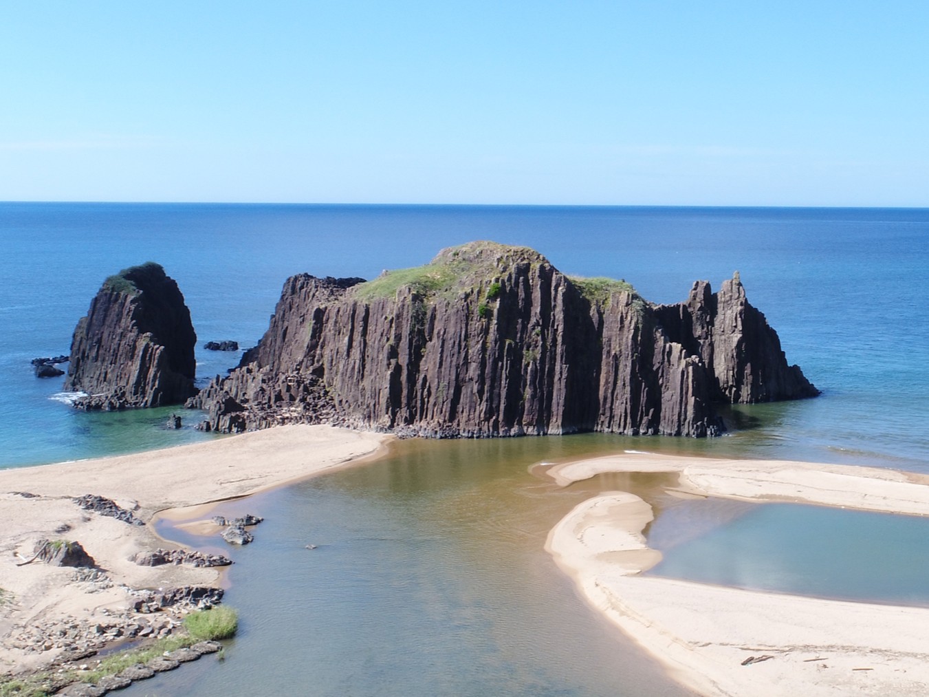 海中からそびえ立つ、黒々とした安山岩の巨大な奇岩。その迫力と美しさから、景観スポットとしても知られる代表的な地質遺産です。