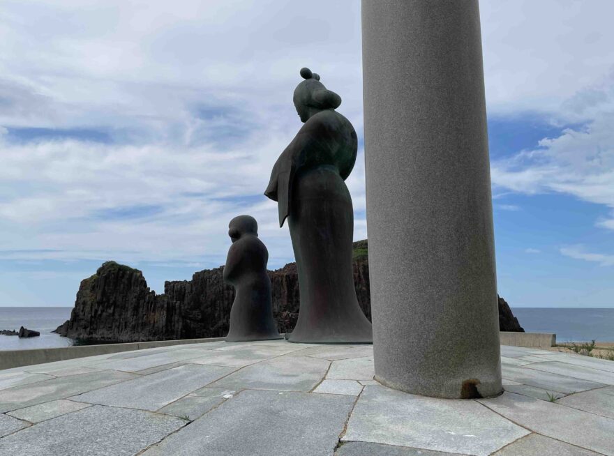母子像の背後に広がる山並み、そびえ立つ立岩、そして空と海が織りなす荘厳で幻想的な景観を、ぜひその場で味わってください。