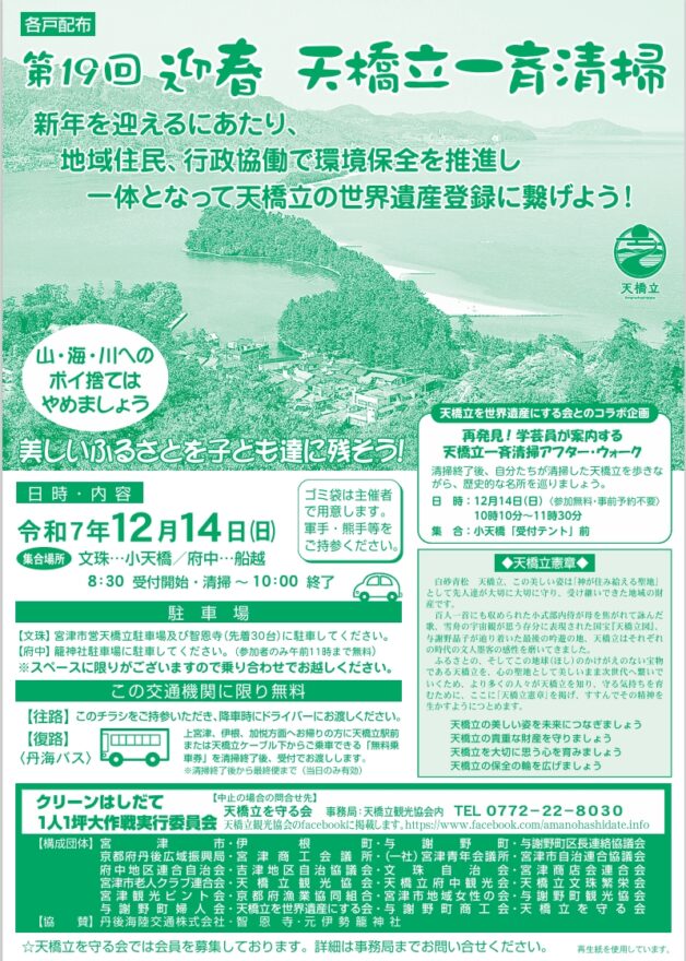 迎春天橋立一斉清掃が、新年を迎えるにあたり実施されます。1人が1坪清掃すれば天橋立が美しくなるということで始まった清掃活動。